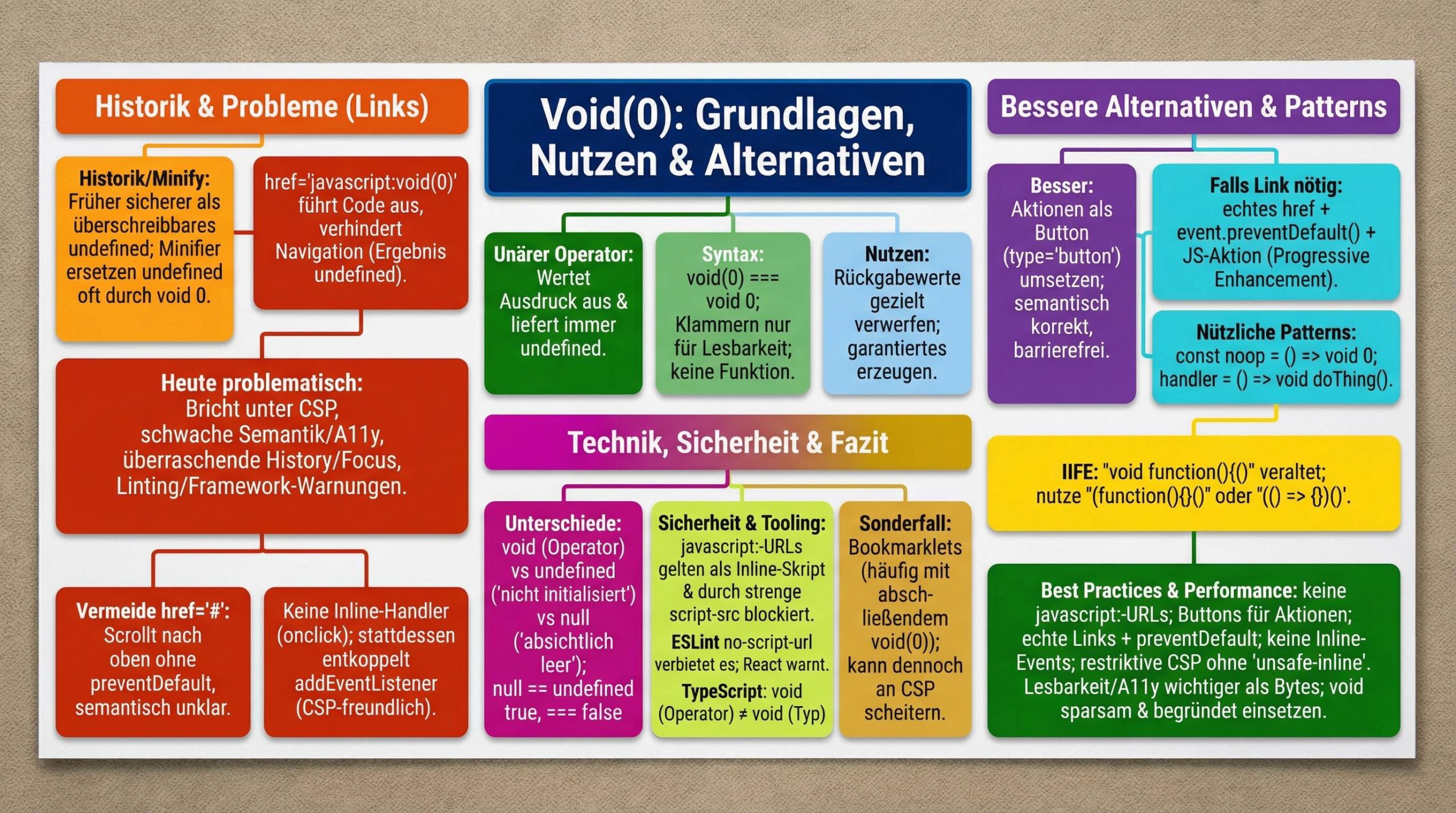 • Nutze void gezielt: z. B. um implizite Rückgaben zu unterdrücken oder garantierte undefined-Werte zu erzeugen. Lass es ansonsten weg.